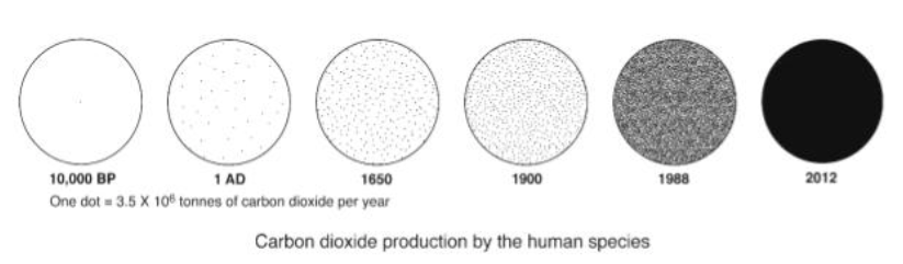 The amount of carbon dioxide emitted by the human population today is around 10,000 times greater than it was when farming began some 450 generations ago, and 90% of this increase has occurred over the past 100 years.